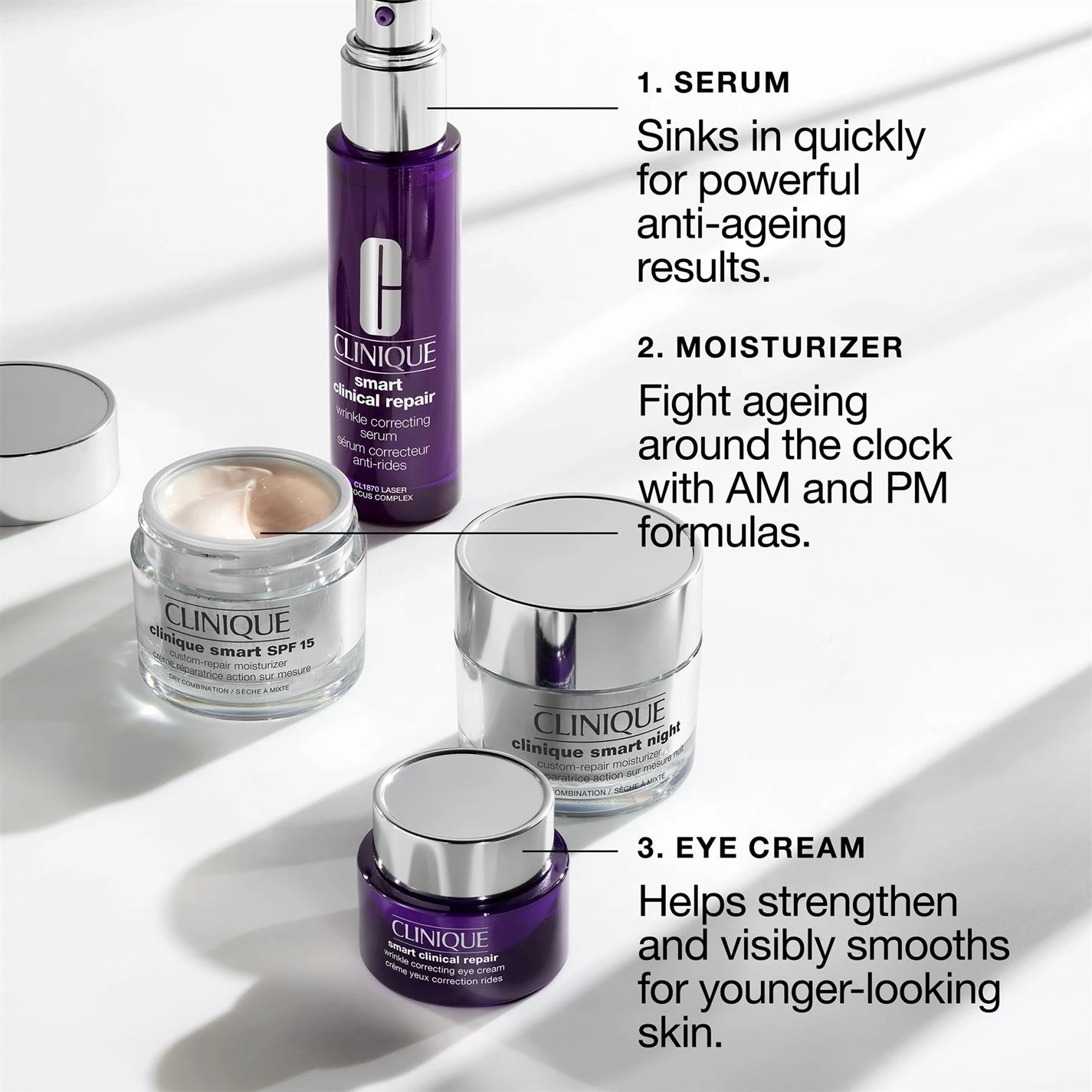 Restore and renew the eye area with the clinique Smart Clinical Repair Wrinkle Correcting eye cream. Formulated with a Peptide complex to smooth and correct fine lines and wrinkles, as well as Hyaluronic acid, Shea Butter and Glycerine to soften and hydrate the eye area, this light-weight eye cream is the ideal product to leave you feeling fresh and awake. Sustainably packaged in a recyclable glass jar. To be used as part of a good skincare regime both day and night for visible results.